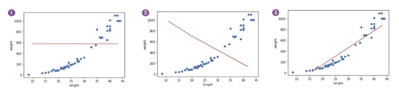 수많은 직선 중 어떤 게 정답일까? 정답은 "실제값과 모델이 예측한 값의 차이(오차)가 가장 적은 선"이다.