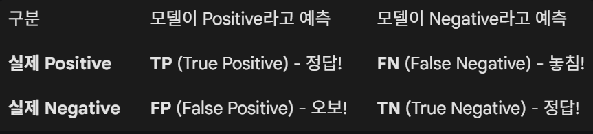 - 정밀도 (Precision): 모델이 "양성"이라고 한 것 중 진짜 양성인 비율. (오탐 방지)