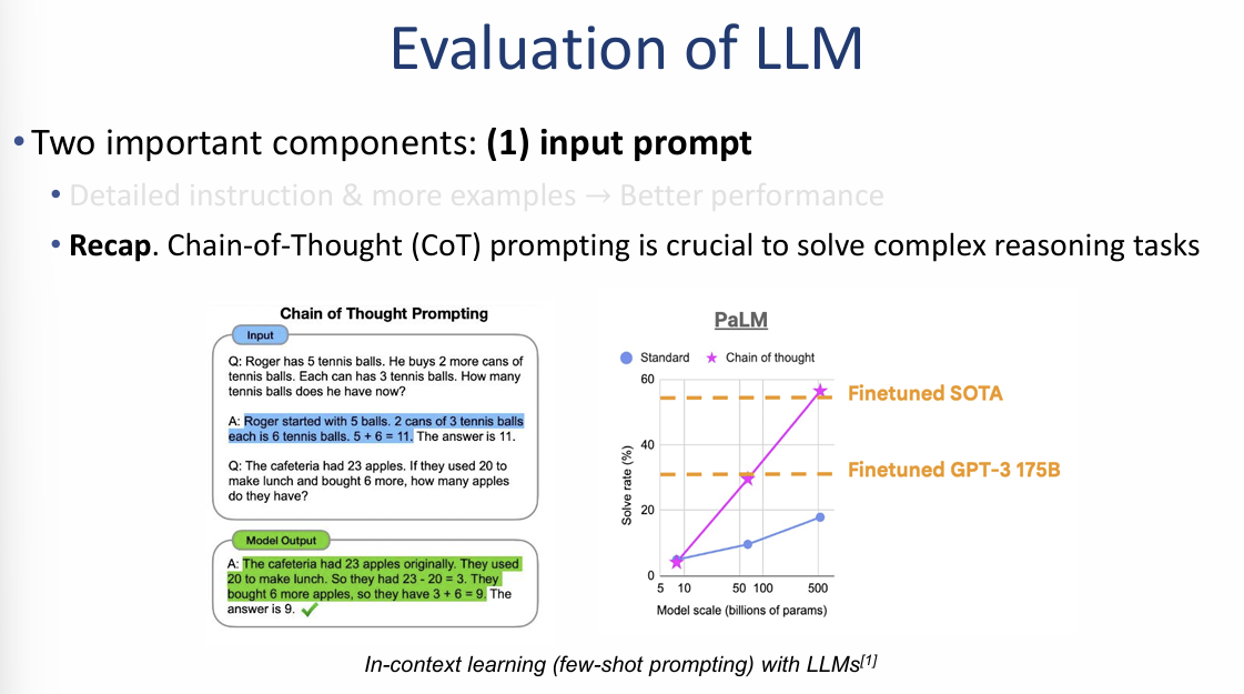 - 효과: PaLM 모델의 사례를 보면, 모델 규모가 커질수록 CoT를 적용했을 때의 문제 해결 능력이 일반적인 방식(Standard)보다 훨씬 가파르게 상승하여 미세 조정된 SOTA 모델의 성능에 근접함을 확인할 수 있습니다.