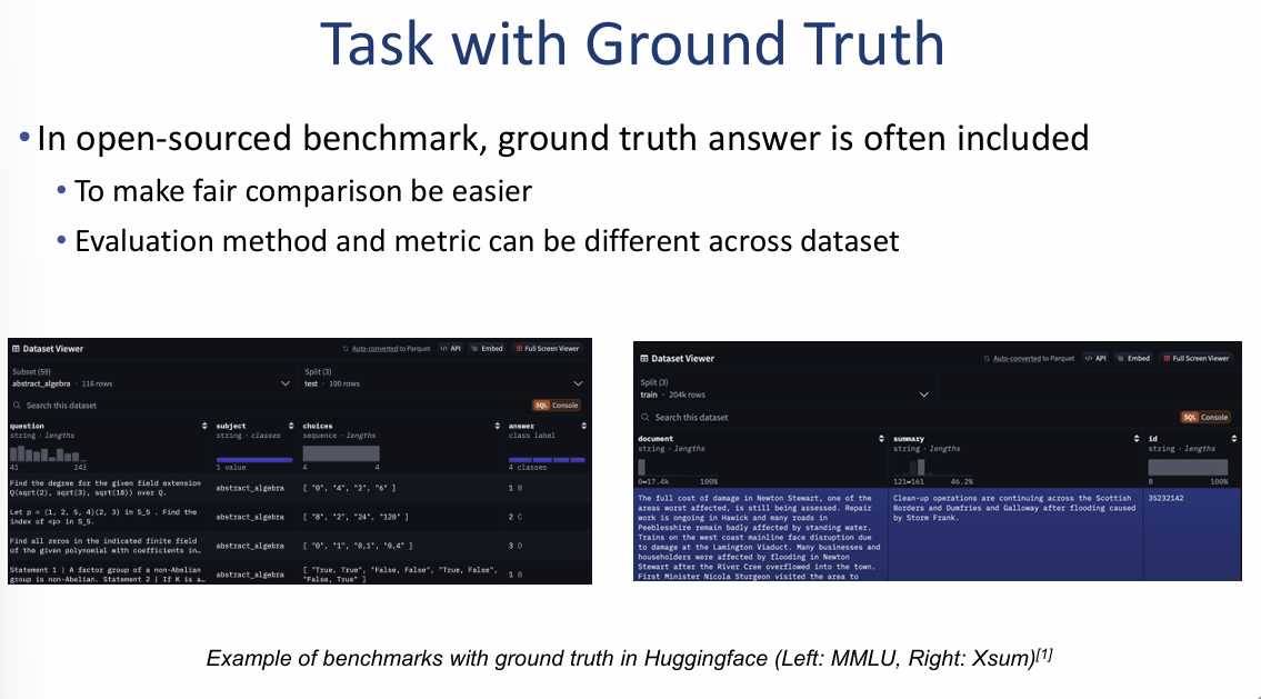 공정한 모델 성능 비교를 위해, 오픈 소스 커뮤니티에서는 미리 정의된 정답(Ground truth)이 포함된 데이터셋을 활용하여 평가를 진행합니다.