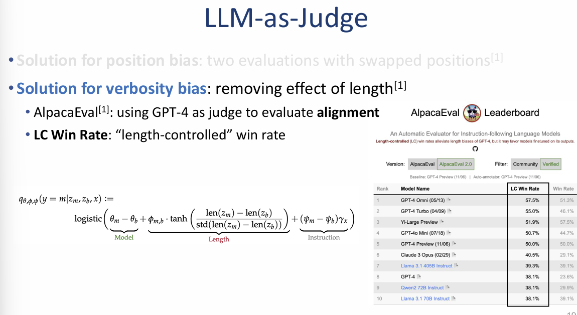 - 구현 사례 (AlpacaEval): GPT-4를 심판으로 사용하는 AlpacaEval 리더보드에서는 답변의 정렬(Alignment) 능력을 평가할 때 답변 길이의 영향을 배제하는 로직을 적용합니다.