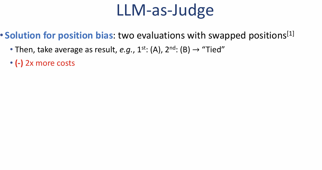 - 위치 편향 (Position bias): 답변의 내용과 상관없이 특정 위치(예: 첫 번째로 제시된 답변)를 더 선호하는 경향이 있습니다.