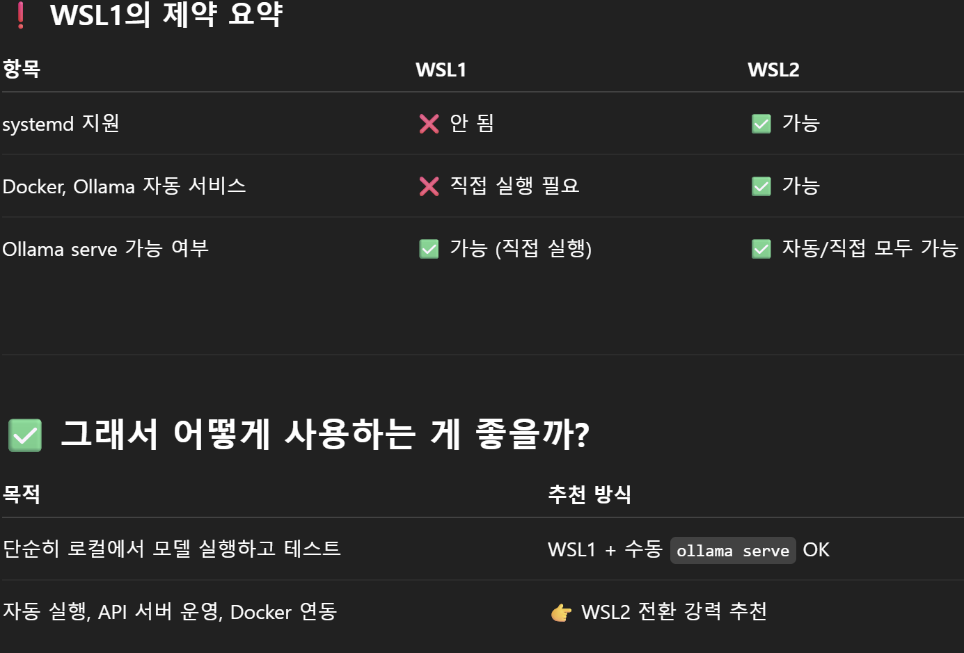 WSL1은 systemd를 지원하지 않기 때문에, Ollama처럼 systemd 기반으로 백그라운드 서비스(데몬)를 구동하는 방식은 사용할 수 없다 wsl2로 바꾸고싶다면 wsl --set-version Ubuntu 2